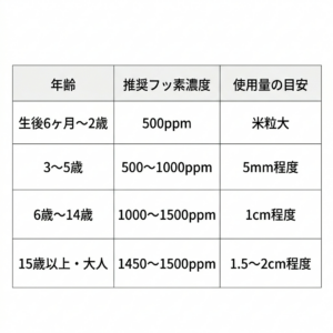 もっとも手軽にフッ素を取り入れられるのが、毎日の歯磨き粉です。選ぶ際はフッ素濃度に注意しましょう。年齢別の推奨濃度は以下のとおりです。